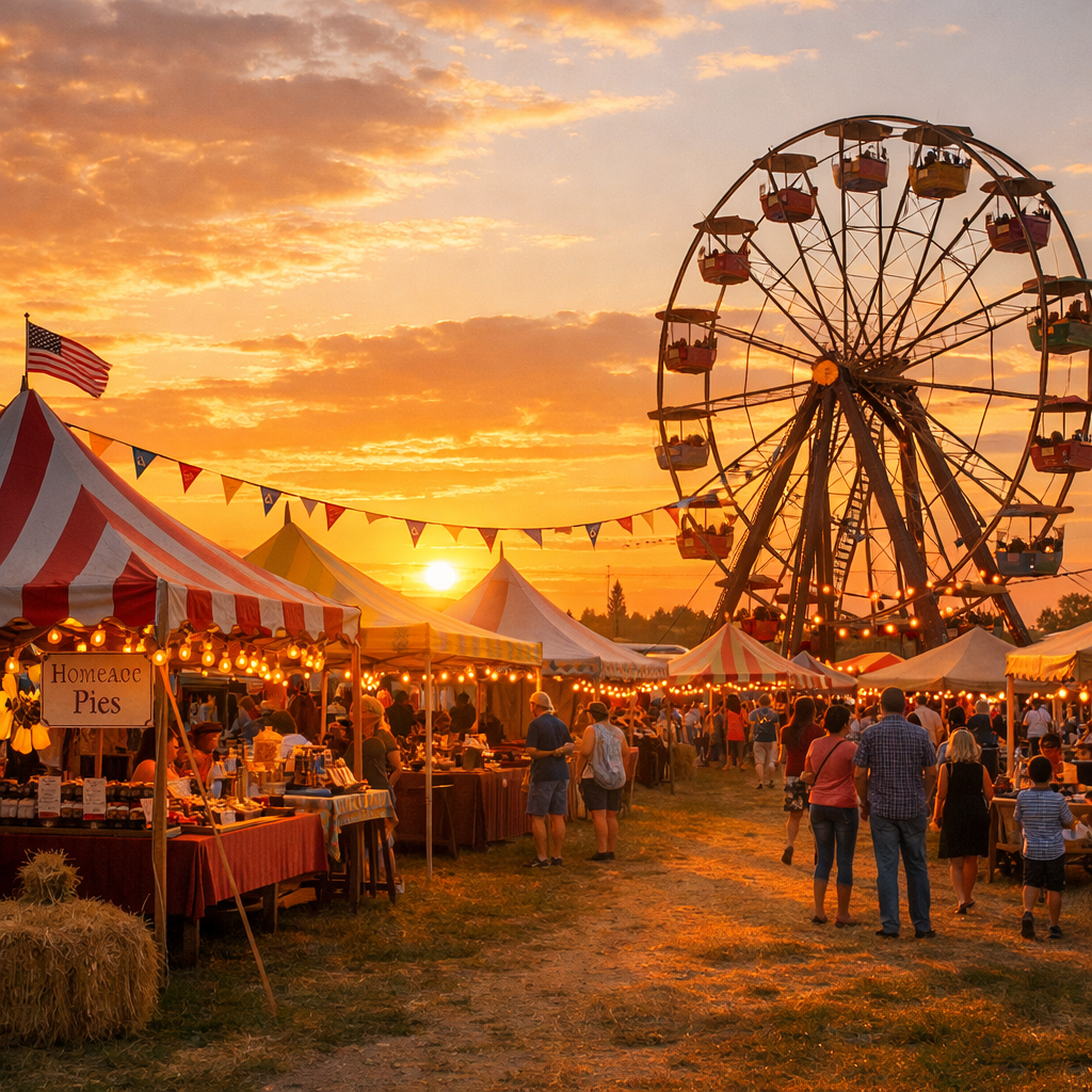 The image captures a lively outdoor fair during sunset, featuring a large Ferris wheel on the right side and several colorful market tents on the left. The sky glows orange and yellow as the sun sets behind the tents, casting warm light over the scene. String lights decorate the tents, creating a festive atmosphere while visitors stroll along the path. One tent prominently displays a ‘Homeade Pies’ sign, adding to the fair’s inviting and community-oriented vibe.